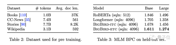 模型采用Books、CC-News、Stories和Wikipedia几种数据集对四类模型进行了训练,根据留出法评估,BigBird-ETC的损失达到了最低。
