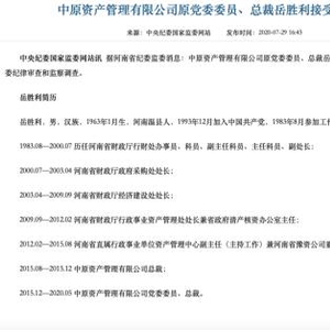 2015年8月,中原资产管理有限公司(简称中原资产)成立,这时,岳胜利从体制职务离任,加入中原资产担任总裁。