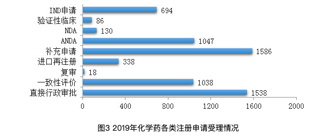 根据审评报告,2019年药审中心受理化学药注册申请6475件,其中受理化学药IND申请694件,较2018年增长了51.9%;受理化学药NDA 130件,较2018年增长了21.5%;受理仿制药上市申请(ANDA)1047件,较2018年增长了6.6%;受理一致性评价补充申请1038件(308个品种),件数较2018年增长71%。