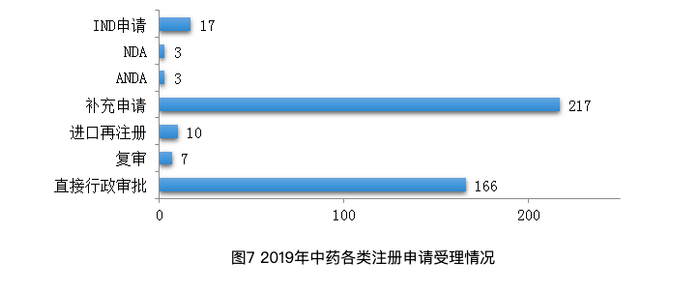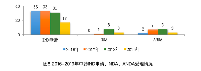 去年,药审中心受理中药注册申请423件,其中受理中药IND申请17件,受理中药NDA 3件,受理中药ANDA 3件。2019年中药各类注册申请受理情况详见图7。2016-2019年中药IND申请、NDA和ANDA受理情况详见图8。