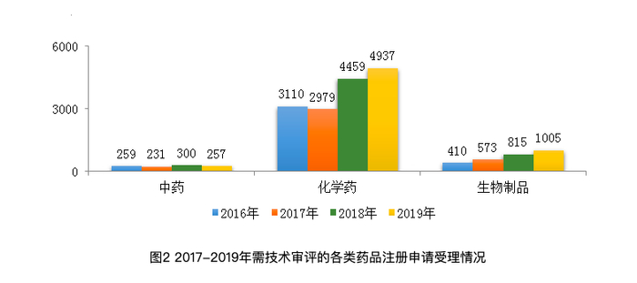 2019年,受理需技术审评的注册申请6199件,较2018年增加11.21%,其中化学药注册申请为4937件,较2018年增长了10.72%,占全部需技术审评的注册申请受理量的79.64%;生物制品注册申请1005件,较2018年增长了23.3%。2016-2019年需技术审评的化学药、中药和生物制品注册申请受理情况详见图2。