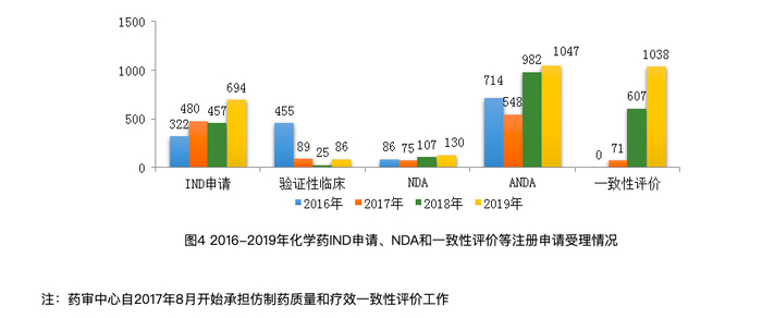 2019年化学药各类注册申请受理情况详见图3。2016-2019年化学药IND申请、NDA和一致性评价等注册申请受理情况详见图4。