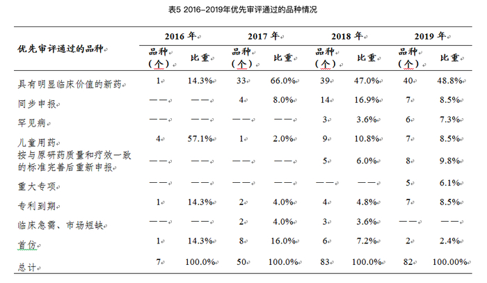 2019年有143件注册申请(按通用名计82个品种)通过优先审评程序,得以加快批准上市——如我国自主研发的1类创新药注射用甲苯磺酸瑞马唑仑、甘露特钠胶囊,治疗罕见病法布雷病注射用阿加糖酶β,新型核因子κB受体激活因子配体(RANKL)抑制剂地舒单抗注射液,治疗糖尿病的聚乙二醇洛塞那肽注射液、治疗银屑病的本维莫德乳膏、非小细胞肺癌靶向治疗药物达可替尼片等药品。近几年优先审评的品种情况详见表5。
