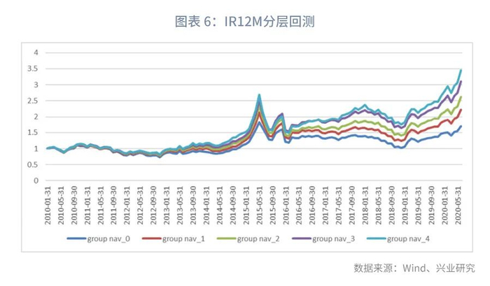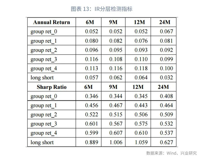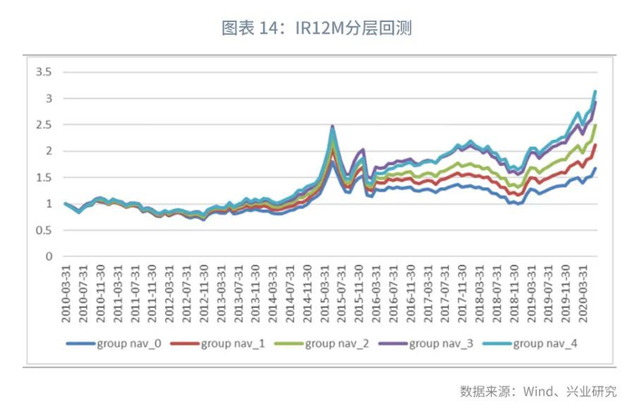 IR:通过分层检测可以看出,IR维度不同频率因子均有分层效果,因子从高到低排成五组组成的策略收益、夏普均严格保序;IR维度因子频率12M、9 M、6 M表现相仿,24M表现较差。从多空组合年化收益来看,IR12M最高为7.3%,IR6M、9M、24M分别为6.4%、6.9%、5.3%。从多空组合年化夏普来看,IR12M最高为1.077,IR6M、9M、24M分别为0.91、0.96、0.924。