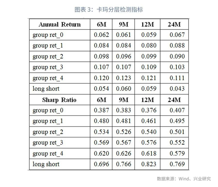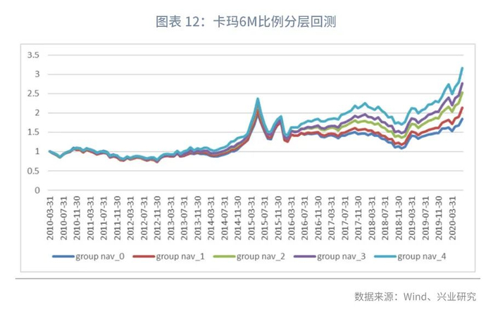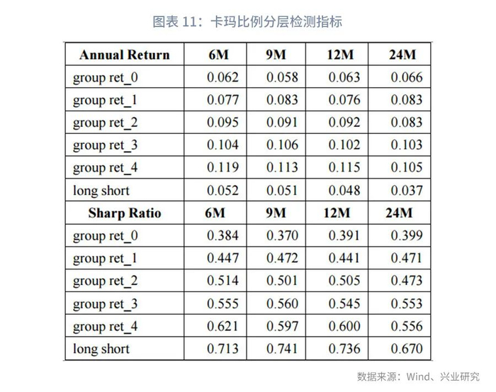 卡玛比率:通过分层检测可以看出,卡玛维度不同频率因子均有分层效果,因子从高到低排成五组组成的策略收益、夏普均严格保序。选取过去9个月卡玛因子分层效果最明显,因子最高一档组合年化收益高达12.35%,夏普比例高达0.626,因子最低一档组合年化收益为6.07%,夏普比例为0.383。从多空组合年化收益来看,卡玛9M最高为5.97%,卡玛6M、12M、24M分别为5.43%、5.94%、4.28%。从多空组合年化夏普来看,卡玛12M最高为0.8231,卡玛6M、9M、24M分别为0.6957、0.7662、0.7694。