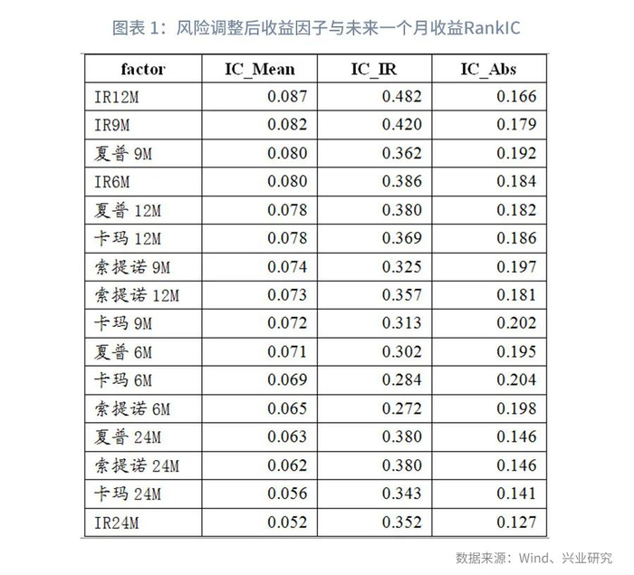 以IC Mean5%为界限,IR、夏普、卡玛、索提诺比例分别用过去6、9、12、24个月因子全部通过初步检验,且IC正显著比例大于0.65。以IC正显著比例为降序排列,各维度因子胜率最高分别是:IR12M、卡玛12 M、夏普12 M以及索提诺12 M。