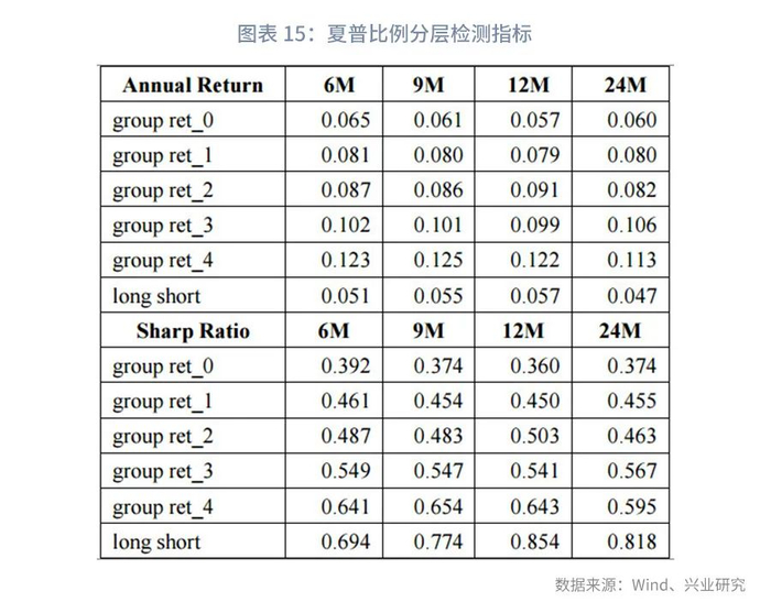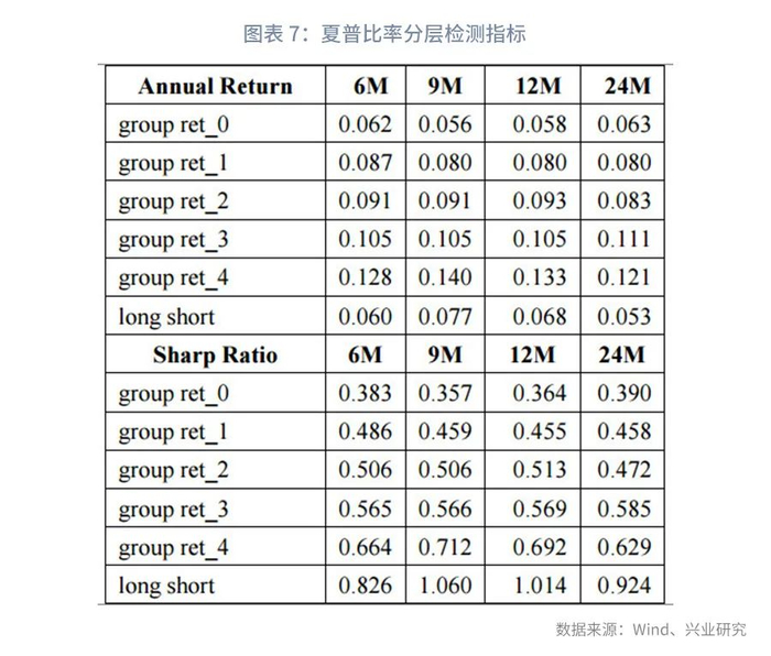 夏普比率:通过分层检测可以看出,夏普维度不同频率因子均有分层效果,因子从高到低排成五组组成的策略收益、夏普均严格保序;其中夏普9M与12M效果最好,多空组合年化收益分别为7.7%、6.8%,夏普分别为1.06、1.014;夏普6M、24M分层效果较差。多空组合年化收益来看,夏普9M最高为7.7%,夏普6M、12M、24M分别为5.97%、6.8%、5.29%。多空组合年化夏普来看,夏普9M最高为1.06,夏普6M、12M、24M分别为0.826、1.014、0.924。