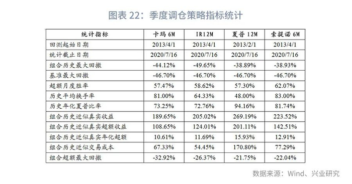分别将上述因子每期选择因子暴露最大的10只基金构建组合,季度换仓,从2013年4月1日回测至2020年7月16日。从年化超额收益、年化夏普、超额最大回撤角度来看,夏普12M表现最好,其年化超额最高为15.93%,年化夏普最高为0.94,超额最大回撤最低为-21.75%。超额月度胜率角度来看,索提诺6M最高为62.07%。