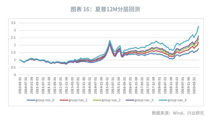 夏普比率:通过分层检测可以看出,夏普维度均有分层效果,因子从高到低排成五组组成的策略收益、夏普均严格保序。选取过去12M夏普因子分层效果较明显,因子最高一档组合年化收益为12.2%,夏普比例分别为0.643,因子最低一档组合年化收益为5.7%,夏普比例分别0.36。从多空组合年化收益来看,夏普12M最高为5.7%,夏普6M、9M、24M分别为5.1%、5.5%、4.7%。从多空组合年化夏普来看,夏普12M最高为0.854,夏普6M、9M、24M分别为0.694、0.774、0.818。