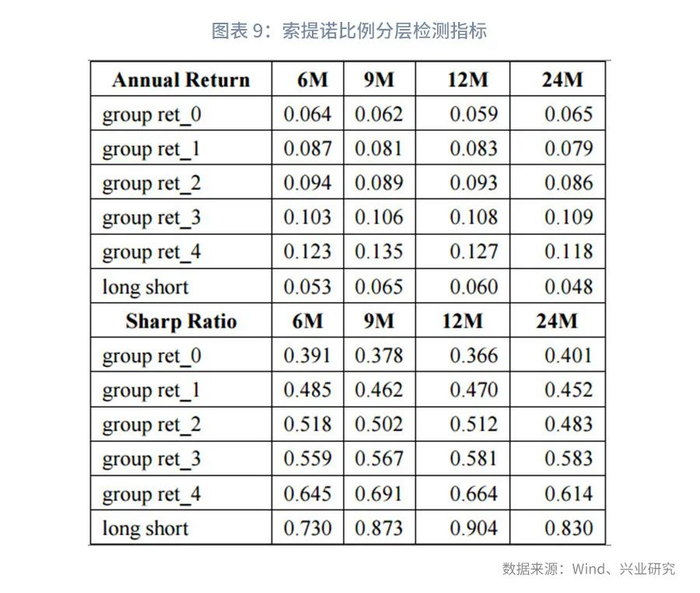 索提诺比率:通过分层检测可以看出,索提诺维度不同频率因子均有分层效果,因子从高到低排成五组组成的策略收益、夏普均严格保序;其中因子频率9M、12M分层效果最好,多空年化收益分别为6.5%、6%,多空夏普分别为0.873、0.904;因子频率6M、24M分层效果较差。多空组合年化收益来看,索提诺9M最高为6.5%,索提诺6M、12M、24M分别为5.3%、6%、4.8%。多空组合年化夏普来看,索提诺12M最高为0.904,索提诺6M、9M、24M分别为0.73、0.873、0.83。