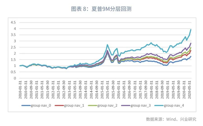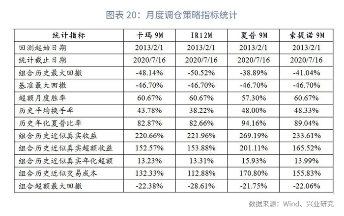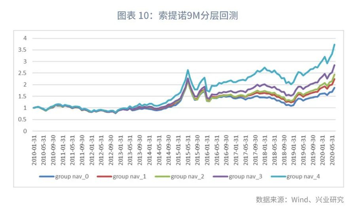 分别将上述因子每期选择因子暴露最大的10只基金构建组合,每月换仓,从2013年2月1日开始回测至2020年7月16日。从年化超额收益、超额最大回撤与年化夏普比例考量,夏普9M因子表现最好,其年化超额最高为15.93%,差额最大回撤最小为-21.75%,年化夏普比例最高为0.94。从超额月度胜率角度来看,卡玛9M、IR12M与索提诺9M表现相近,约60.67%,夏普9M为57.3%。