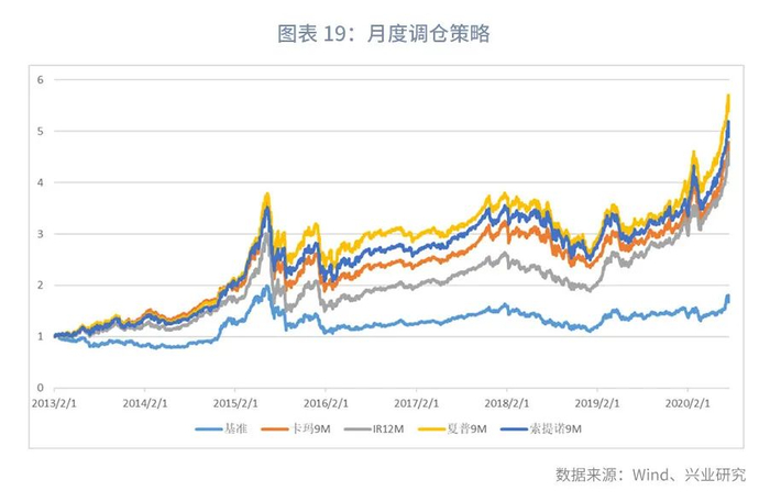 通过对未来一个月收益的单因子RankIC检测与分层测试,分别选取每个因子表现最好的频率构建单因子,每期选取暴露最大的十只基金构建组合月度换仓回测从2013年2月1日至2020年7月16日,展示每个维度效果最好的策略。
