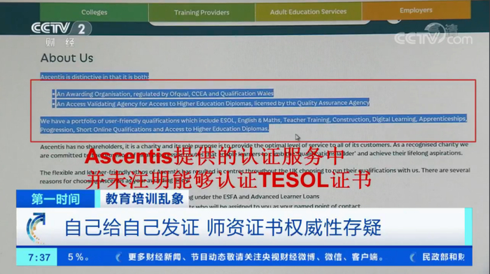 然而记者调查发现,根据Ascentis官网显示,其所能提供的资格证书认证服务中,并不包括TESOL证书。同时,记者将阿卡索外教证书发送至Ascentis上级机构——英国资格验证和考试管理办公室,对方明确回复阿卡索平台所展示的外教资质证书并不受其监管。