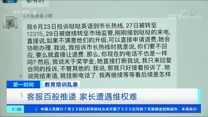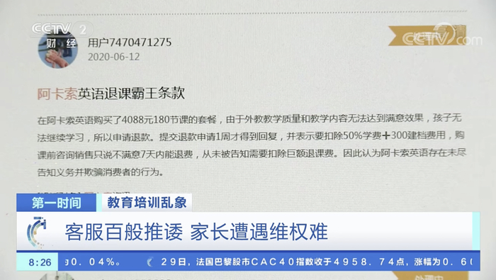 最让家长烦心的还是退费维权难,多名家长向央视记者表示,由于不满意课程服务要求机构退费,但维权过程中阻碍重重。家长秦女士表示,阿卡索客服电话无法打通,官网留言后客服回复无法退费;段女士则表示哒哒英语没有人工客服,与机构沟通后则始终被告知在排队,拨打客服电话无人接听。