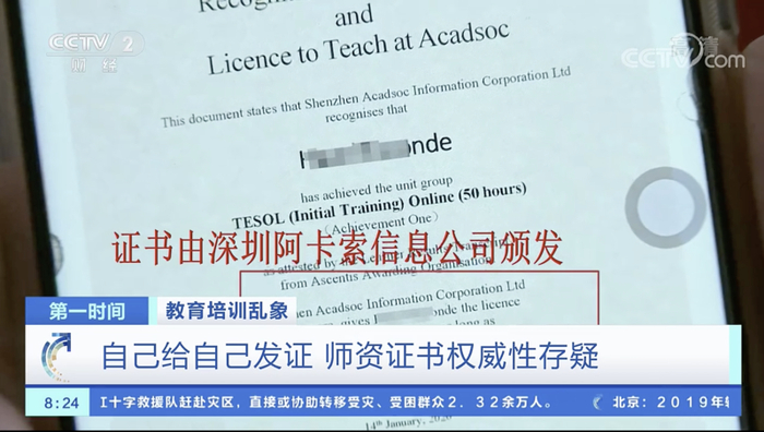 更惊人的是,央视记者发现,阿卡索提供的上述证书显示,颁发单位为深圳阿卡索信息公司。多名家长也因此质疑外教资质证书权威性。针对质疑,阿卡索工作人员的回应含糊其辞,称看不懂英文、不清楚证书由哪里颁发。