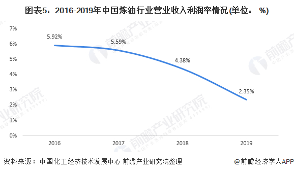 从营业收入利润率方面来看,2016-2019年炼油业营业收入利润率整体处于较低水平,并呈逐年下降态势,2019年该值为2.35%,同比下降1.90个百分点,说明我国炼油行业盈利能力较弱。