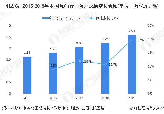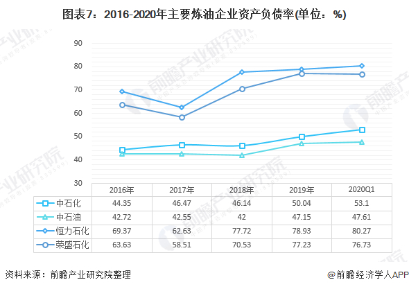 2015-2019年中国炼油行业资产总额呈现稳定上升趋势,2017年以来增速均在10%以上。2019年资产总额为2.59亿元,同比增长19.7%。与此对应的是炼油企业,资产负债率上涨,2019年恒力石化和荣盛石化的资产负债率均超过了75%。