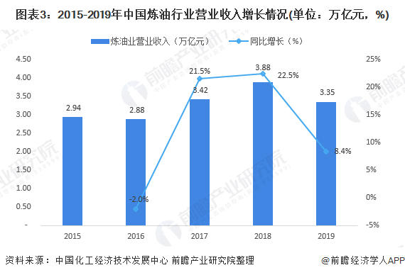 2019年,全球市场剧烈动荡,宏观经济下行压力不断加大。石油和化工行业增加值同比增长4.8%;营业收入12.27万亿元,增长1.3%,其中,炼油业营业收入成本3.35万亿元,同比增加8.4%。