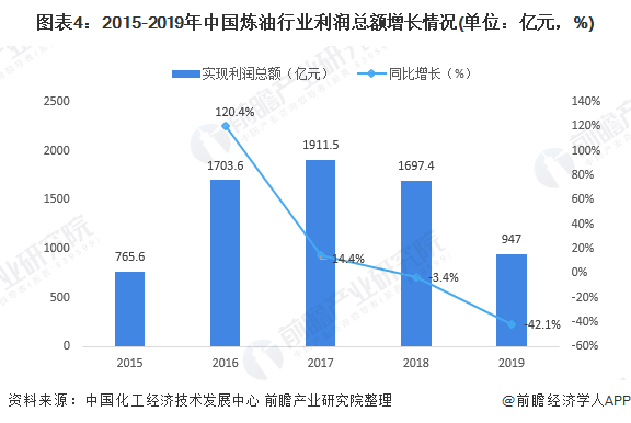 从2018年开始,我国炼油业利润总额步入下行区间,2019年降幅进一步增长。2019年炼油业规模以上企业全年实现利润总额947.0亿元,同比下降42.1%,降幅较前11个月收窄7.1个百分点,占石油和化工行业利润总额的14.2%。