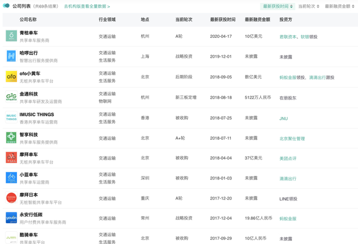 自2016年起至少有69家公司参与到共享单车赛道中