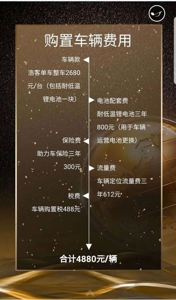 据时代周报记者了解,投资者需和浩克单车签订《助力车委托购买及运营托管协议书》,合同期限为三年。每辆浩客共享电单车的购置款为4880元,几乎等同于一部华为Mate 30手机的价格。