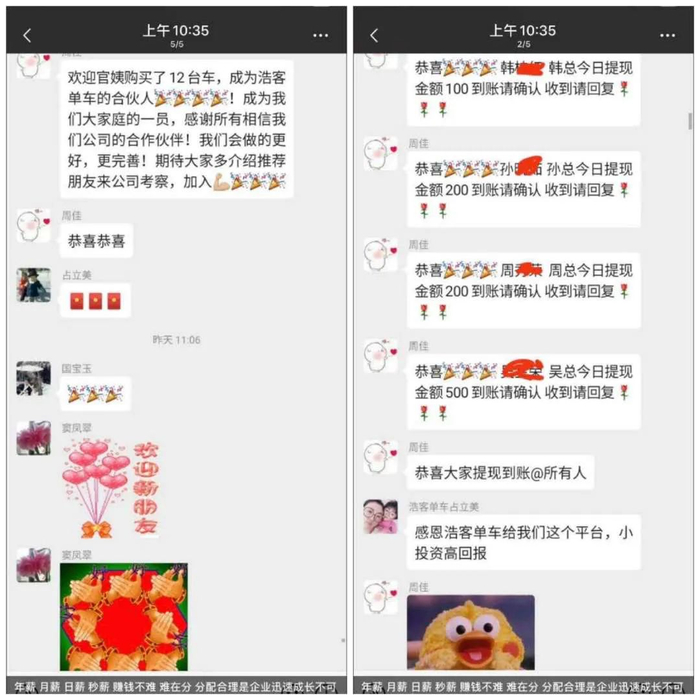 浩克单车微信群里充斥大量“提现”和“合伙人”消息