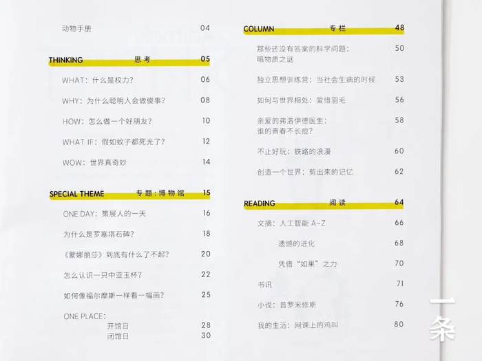 分为思考、专题、新知、专栏、阅读这几个板块,每一个板块都充满真知灼见,把课本里、大人们忽视的问题,和孩子们聊一聊。