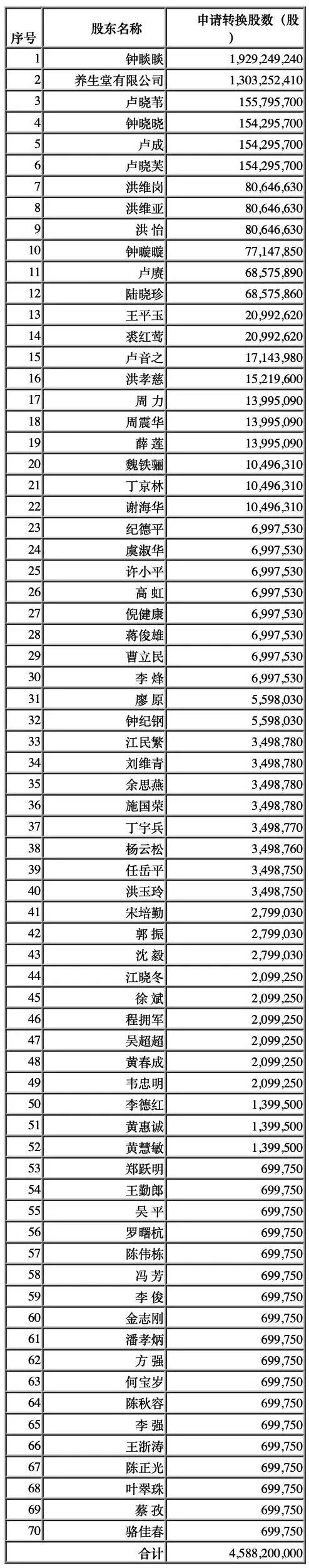 同时,据公告,证监会核准公司股东养生堂有限公司等70名股东(股东名称见下表)所持合计4,588,200,000股境内未上市股份转为境外上市股份,相关股份完成转换后可在香港交易所上市。股东名称及转换数量为: