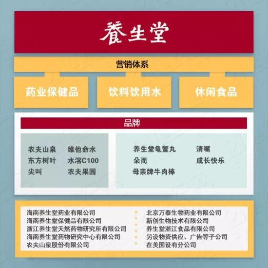 除此之外,养生堂还在还下设物资供应、广告、地产、信息化等子公司,并在美国、日本等设有分公司,养生堂的布局已呈现出集团业务板块多元化和各细分领域多元化的特点。