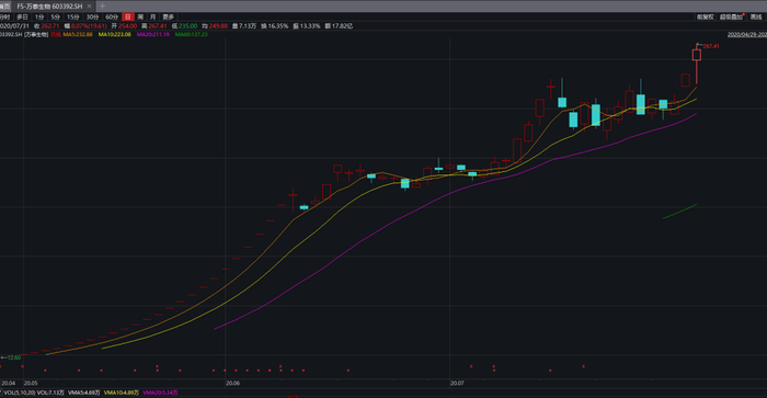 万泰生物发行价8.75元/股,发行数量4360万股。截至2020年7月31日收盘,万泰生物收于262.71元/股,相较发行价暴涨近30倍之多,总市值高达1139亿元。