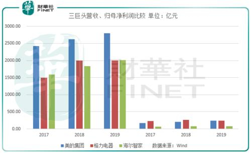Wind数据显示,美的电器2018年营收突破2500亿元规模,海尔智家和格力近三年营收依然在2000亿元规模徘徊。其中海尔智家在2017、2019年营收险胜格力。