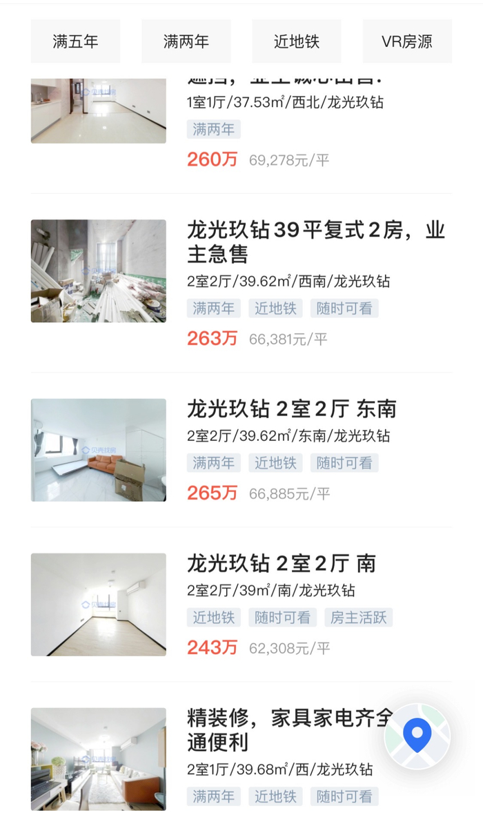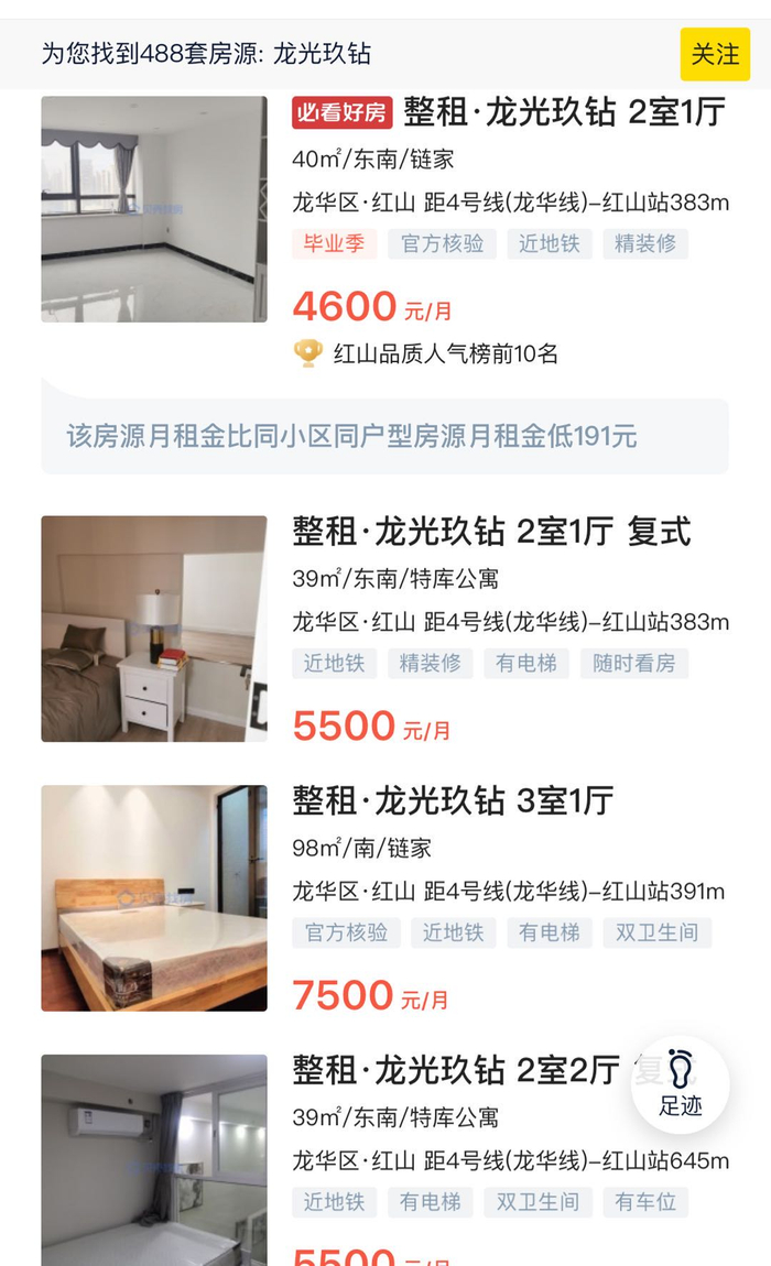 去年销售火爆的龙华网红公寓龙光玖钻,当时39平的复式两房总价280万起、71平的复式三房总价368万起、132平的平层四房总价680万起。记者查阅贝壳二手房网最新信息来看,目前该楼盘的39平的两房户型挂牌售价仅240-270万而已。此前,这个户型,中介推荐每月租金可达8000元每月的不足40平的单身公寓,贝壳二手房网显示租金也只租到4500-5500元每月,和销售说的8000元每月存在一定的差距。