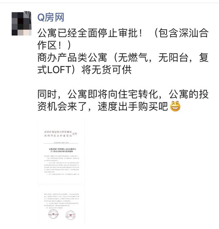 “这个政策,对商务公寓是利好还是利空?“、”商务公寓还能不能买?“、”深圳目前不受影响的商务公寓有多少?”……各种疑问在群内刷屏。