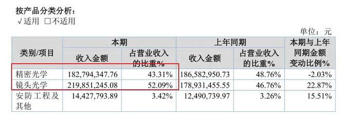 另外,从产品收入比重来看,镜头光学已经超过了起家的精密光学部分,占比最高。并且,公司还有一部分安防工程业务。