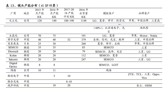 第二梯队包括玉晶光、舜宇光学科技(HK:02382)和关东辰美。