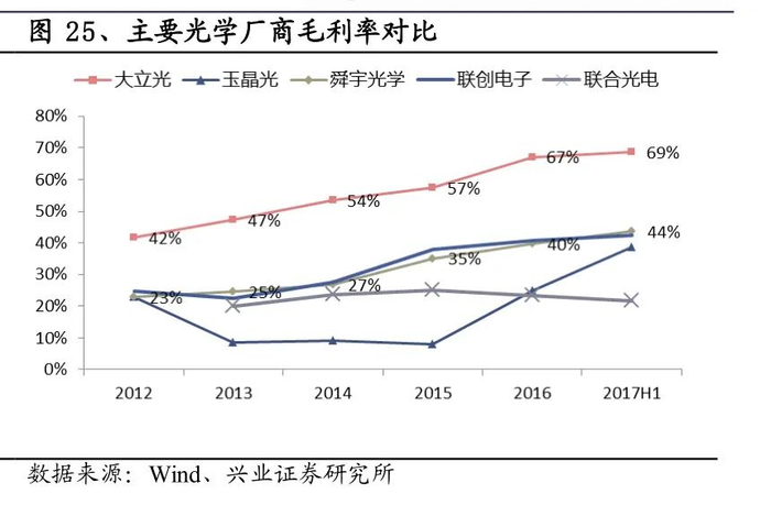 从毛利率来看,苹果供应商大立光高达69%,舜宇光学在44%,并且两者在不断提升。