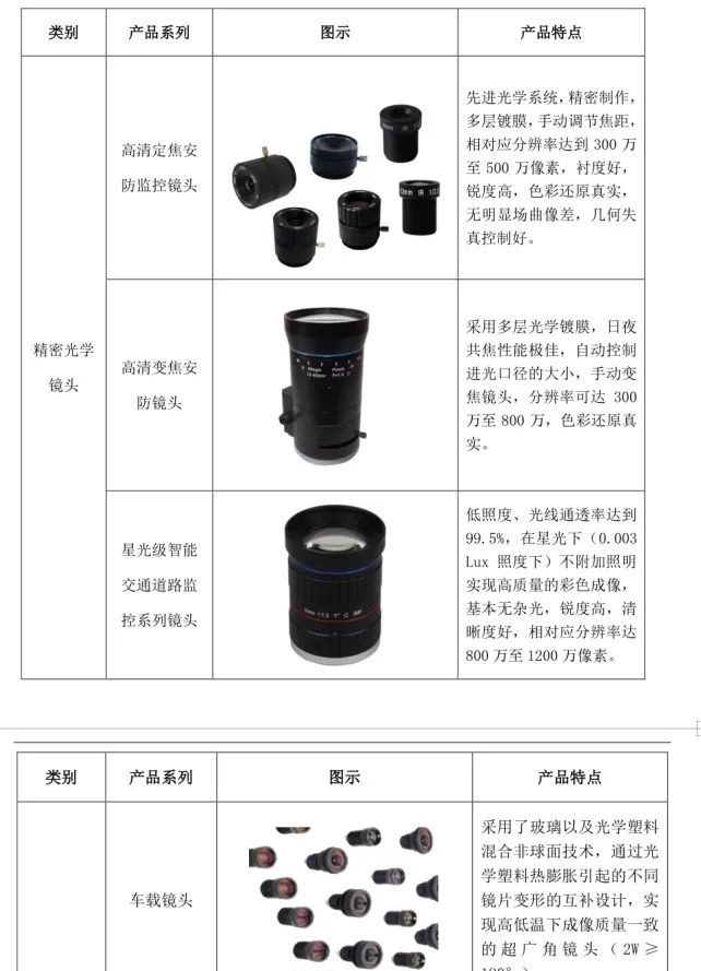 精密光学镜头主要包括:高清定焦安防监控镜头、高清变焦安防监控镜头、高清智能交通镜头等通用安防镜头;星光级低照度智能交通镜头;车载镜头,抗耐辐射镜头、直升机测距、机器视觉镜头等特殊定制镜头。产品主要用于安防监控、道路监控、卡口监控、电子警察系统和车载摄像头等领域。
