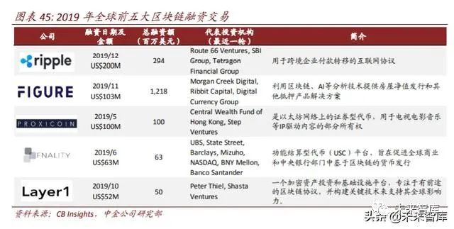 加密货币相关公司的融资额远大于联盟链公司。据 CB Insights 统计数据,2015-2019 年, 以加密货币的管理、托管、交易等为主业的公司所获得的融资额为 84.2 亿美元,是联盟 链公司所获融资额(12.9 亿美元)的 6.5 倍。而在 2019 年的联盟链公司融资额(4.3 亿 美元)中,ripple 的 C 轮融资额达到 2 亿美元,占比接近一半。