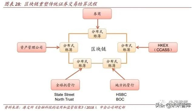 交易后清算:区块链增加透明度、缩短清算时间。金融市场的清算流程涉及基金公司、 证券公司、交易所、本地托管行、全球托管行等可能来自不同国家的主体,整个清算流 程复杂,交易成本高昂。以香港为例,证券交易日和交割日需要 2 天时间。国际咨询公 司 Oliver Wyman 估计清结算环节每年为市场增加了 650~800 亿美元的成本。
