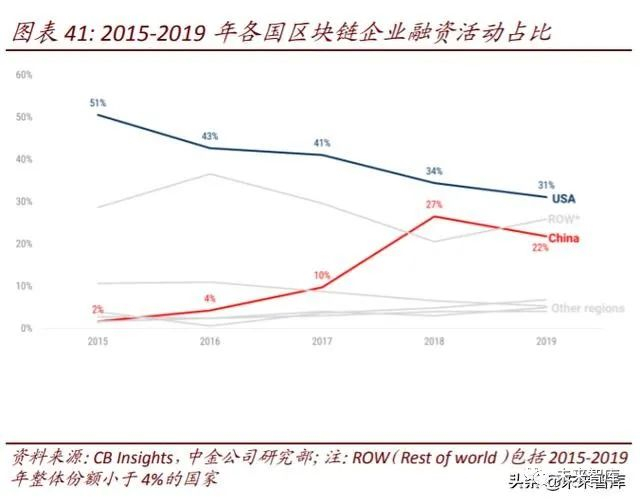 2019 年区块链行业融资额大幅回落,中国企业融资总额仅次于美国。据 CB Insights 统计 数据,2019 年区块链行业融资金额为 27.9 亿美元,同比去年下滑 35%;总交易数 807 笔, 相比去年的 822 笔小幅下滑;平均每笔交易融资金额为 346 万美元,同比下滑 33%。从 融资的区块链企业所在地来看,2019 年美国和中国区块链企业仍然获得了最多的融资, 占比分别为 31%、22%。