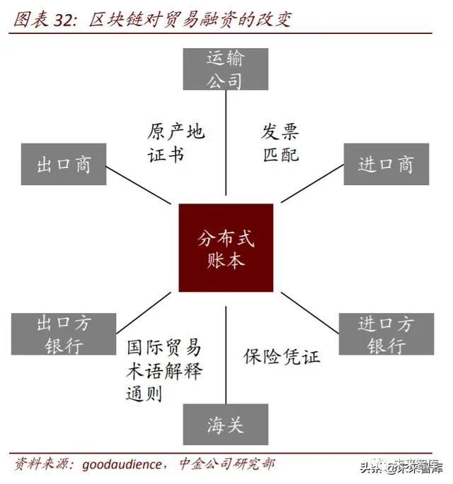 贸易融资:减少交易处理时间及造假风险。区块链的智能合约技术,可实现贸易环节全 流程掌控。利用智能合约,跨境贸易各环节都可被接入区块链平台,1)可以很好地解决 贷前调查、贷中审查、贷后管理实时监控,保证预设条件触发后强制及自动执行相关流 程;2)减少人力投入,提升投入产出比;3)信息集中上链,利于银行准确进行信息验 证和对比,减少造假风险。