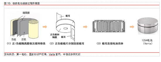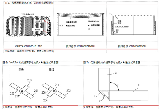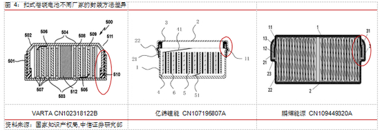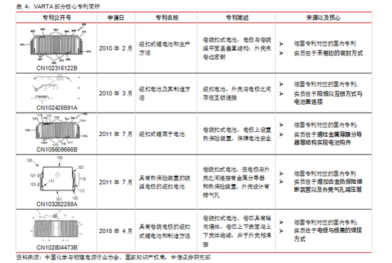 VARTA 是扣式电池技术领先者,在知识产权方面提前布局。VARTA 围绕扣式卷绕电池在全球范围内申请了众多专利,专利实质主要涉及:(1)壳体封装:未卷边的密封方式。(2)外壳结构:外壳包括上下极盖及密封圈,为三组件直筒扣式电池。(3)结构件连接:VARTA 电池采用阳极与极盖凹槽互锁及极片留白区通过物理热压或焊接方式与极盖直接相连。(4)安全组件:电池外加热保险装置形成过温保护。