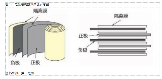 叠片电池与卷绕电池电芯路线不同。以紫建电子为代表的叠片路线将正负极片与隔膜依次堆叠,与卷绕路线电芯制造方式具有明显不同。叠片电池的每片正负极片均连有极耳,而卷绕电池仅在两端连接极耳。此外,紫建电子正负极片采用了单层活性层涂覆的技术, 节约生产资源,同时可降低工作环境污染。