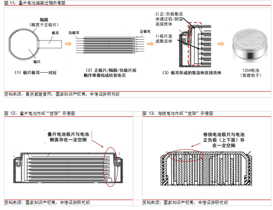 电池容量主要取决于空间利用率。扣式锂电池负极片和隔膜需略宽于正极片,以实现较好的包覆,保证电池正常工作。以 Varta 电池为例,其正极片/负极片/隔膜宽度分别为4.0/4.5/6.0mm,正极片窄于其他二者的部分即出现空隙。从生产过程来看:(1)卷绕电池是将具一定长度的极片和隔膜依次排列并卷绕,两端连接极耳,再将极耳连接壳体进行封装;(2)叠片电池则将正负极极片和隔膜顺序堆叠成柱状电芯,每个极片均连有极耳,正/负极耳连接为正/负集流体,分别通过铝/铜箔连接壳体。由此,卷绕电池内部空隙主要存在于上下端,而叠片电池内部空隙主要存在于侧面。