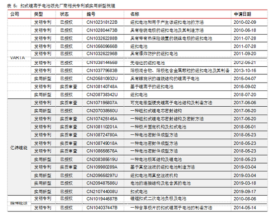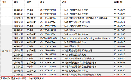 结构设计组合是技术核心,国内企业已实现突破。从专利角度观察,扣式电池技术核心在于将卷绕/叠片电芯制作工艺、极片和极盖连接方式与电池结构设计进行合理组合,从而实现优良的电池性能以及较好的安全性等。国内企业主要针对上述方面规避专利侵权, 通过自主研发在具体结构设计上形成独自的专利体系。目前鹏辉能源、亿纬锂能和紫建电子都有相应的扣式锂离子电池结构设计相关专利,具体如下表: