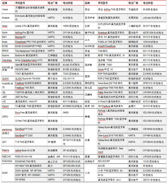 中高端市场扣式电池主导,低端趋向软包电池。目前苹果(Airpods PRO),B&O(Beoplay E8),三星(GalaxyBuds、Gear IconX),索尼(WF 系列),华为(FreeBuds)等主导的中高端 TWS 耳机市场主要采用扣式电池作为耳机电池,单只价值量 15-20 元不等。而一些价格相对较低的国产品牌耳机则倾向于选择产量充足,价格较低的软包电池。从市场上热销的 TWS 耳机电池配套关系来看,目前我国 TWS 扣式电池市场主要竞争者有VARTA、重庆紫建、鹏辉能源、亿纬锂能等。