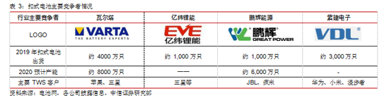 VARTA是扣式电池先行者,国内企业加速追赶。德国VARTA是全球最早从事TWS耳机扣式电池的供应商,对苹果、三星等头部企业供货,估计2019年出货约4,000万只。随着下游需求爆发,VARTA供应紧张,国内厂商积极布局扣式电池市场,鹏辉能源、紫建电子、亿纬锂能2019年出货估计分别约为1,000万只/3,000万只/1,000万只,已经逐步进入三星、JBL、华为、小米等高端客户配套。