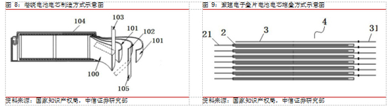 电极装配方式本身并不构成专利障碍。电极装配主要有卷绕和叠片两种方式。电池卷绕工艺是指将电池正极、负极和隔离膜以卷绕的方式组合成形,从而尽可能增大反应面积。德国 VARTA 在早期将卷绕技术成功运用在扣式锂离子电池中,实现了技术的领先。但卷绕技术本身已有几十年的历史,在各类圆柱形、方形锂离子电池生产中广泛应用,属于公示技术,而不构成专利障碍。