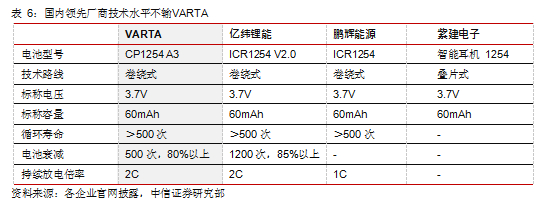 国内厂家扣式锂离子电池性能直追 VARTA。目前国内鹏辉能源、亿纬锂能和紫建电子都已有批量生产的 1254 型号电池产品。从主要性能参数上来看国内厂商与全球领先的VARTA 在 1254 电池产品上已经基本接近,标称容量可达到或接近 60mAh 水平。