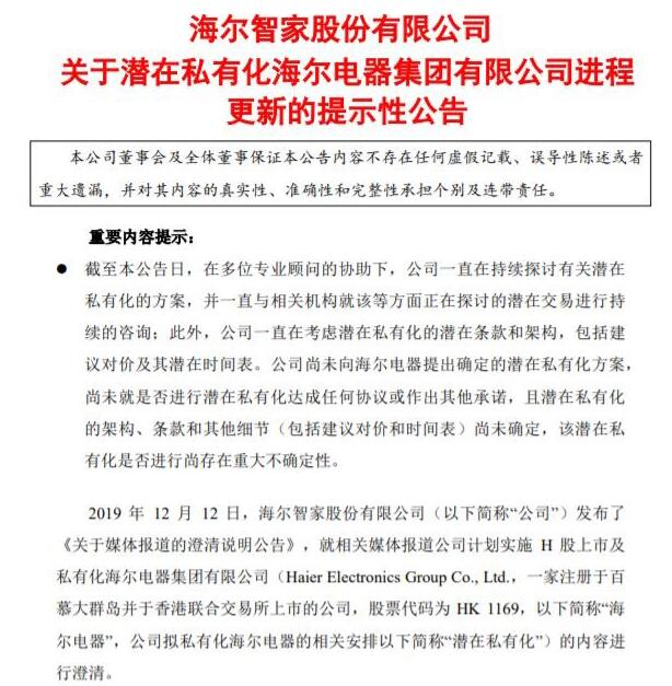 实际上,早在去年12月,海尔智家欲将海尔电器私有化的消息便在市场流传。当时海尔智家承认正在初步探讨私有化海尔电器的方案,随后多次发布进展公告。7月30日,海尔智家因此停牌,海尔电器当日便停牌,市场便推测其私有化方案或将浮出水面。